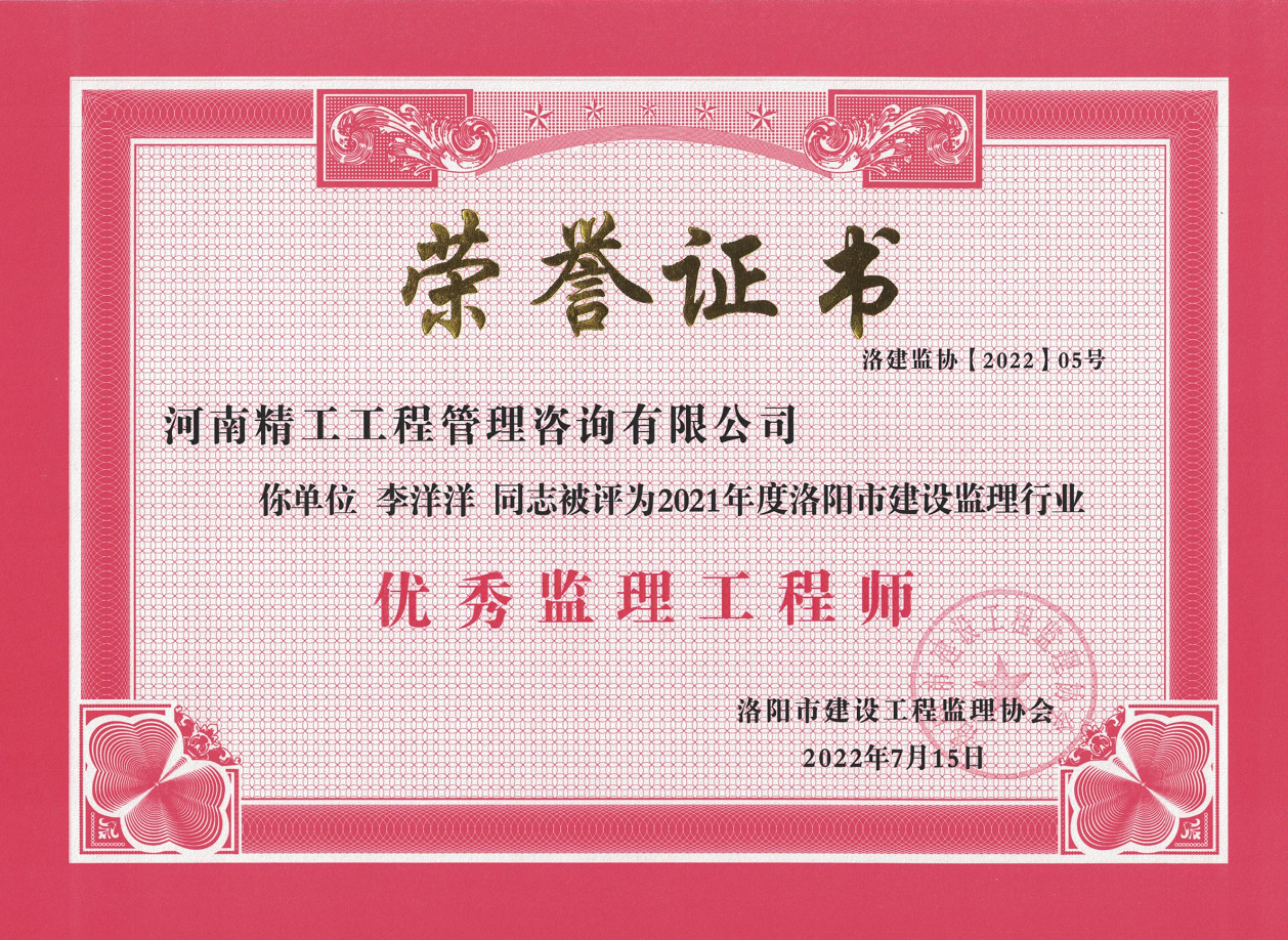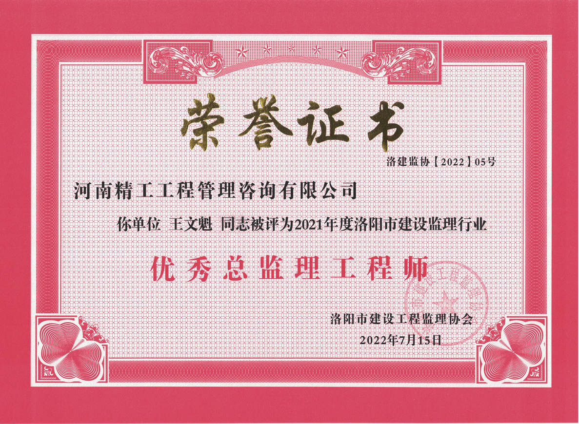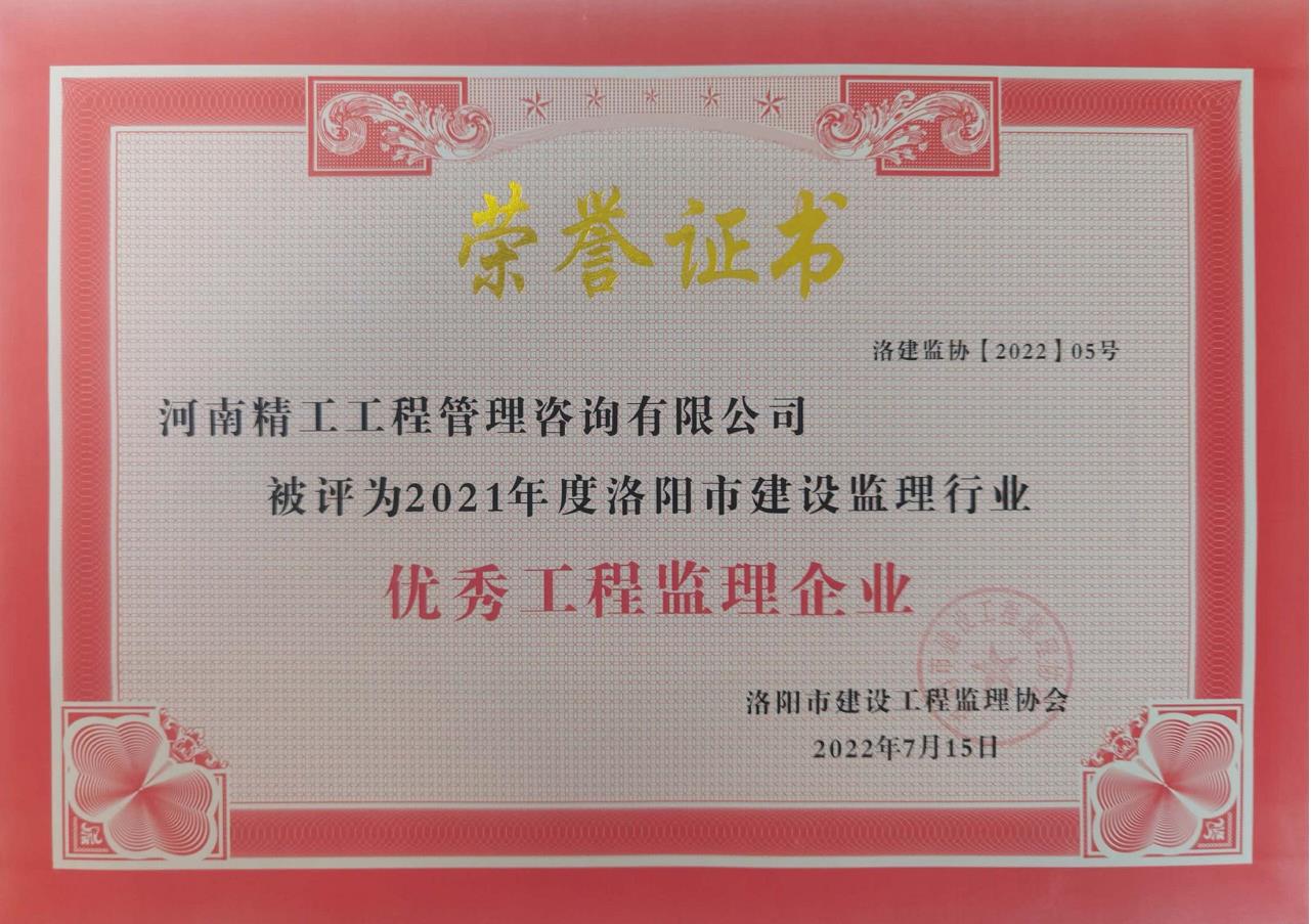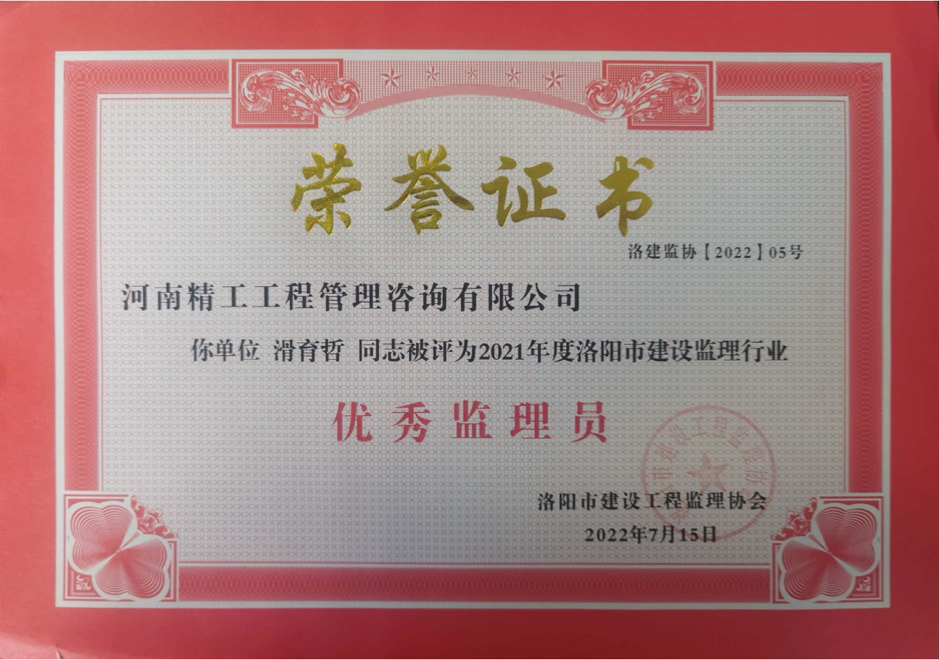 2022年7月18日,洛陽(yáng)市建設(shè)工程監(jiān)理協(xié)會(huì)關(guān)于表彰2021年度洛陽(yáng)市誠(chéng)信建設(shè)先進(jìn)工程監(jiān)理企業(yè)、優(yōu)秀總監(jiān)理工程師、優(yōu)秀監(jiān)理工程師、優(yōu)秀監(jiān)理員的決定,河南精工工程管理咨詢(xún)有限公司榮獲“2021年度優(yōu)秀工程監(jiān)理企業(yè)”,公司2名員工榮獲“2021年度優(yōu)秀總監(jiān)理工程師”,2名員工榮獲“2021年度優(yōu)秀監(jiān)理工程師”,2名員工榮獲“2021年度優(yōu)秀監(jiān)理員”榮譽(yù)稱(chēng)號(hào)。