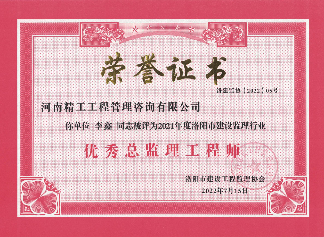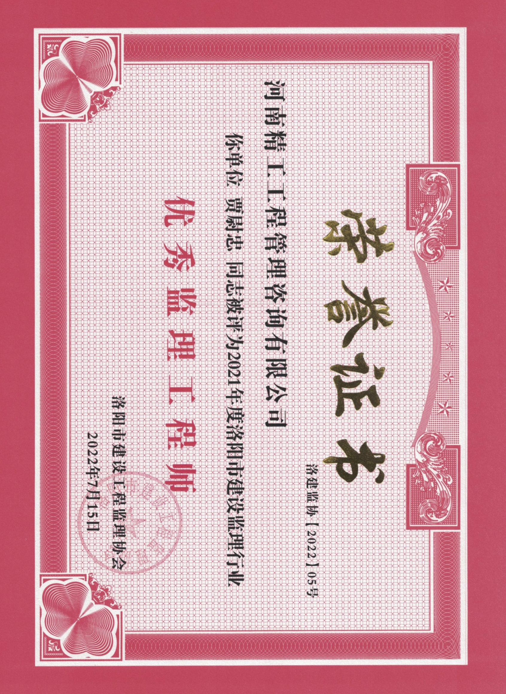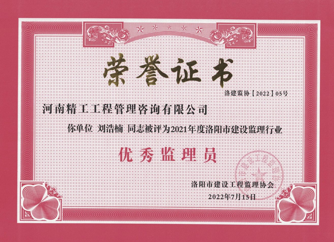 2022年7月18日,洛陽(yáng)市建設(shè)工程監(jiān)理協(xié)會(huì)關(guān)于表彰2021年度洛陽(yáng)市誠(chéng)信建設(shè)先進(jìn)工程監(jiān)理企業(yè)、優(yōu)秀總監(jiān)理工程師、優(yōu)秀監(jiān)理工程師、優(yōu)秀監(jiān)理員的決定,河南精工工程管理咨詢(xún)有限公司榮獲“2021年度優(yōu)秀工程監(jiān)理企業(yè)”,公司2名員工榮獲“2021年度優(yōu)秀總監(jiān)理工程師”,2名員工榮獲“2021年度優(yōu)秀監(jiān)理工程師”,2名員工榮獲“2021年度優(yōu)秀監(jiān)理員”榮譽(yù)稱(chēng)號(hào)。