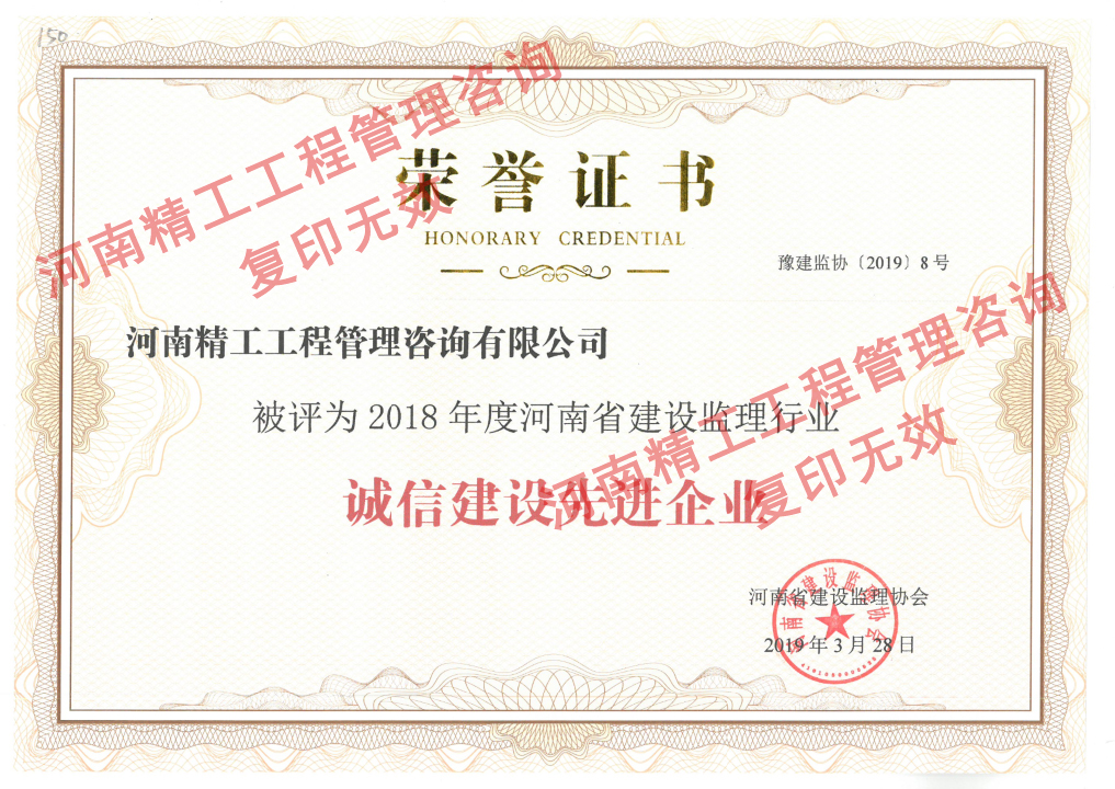 河南精工工程管理咨詢有限公司一直秉承“ 誠以致信,踐以施行”的企業精神,為合作伙伴提供高品質的工程監理服務,同時也得到了社會各界,同行,業主單位的認可,公司至成立以來,連續多年獲得此項榮譽。