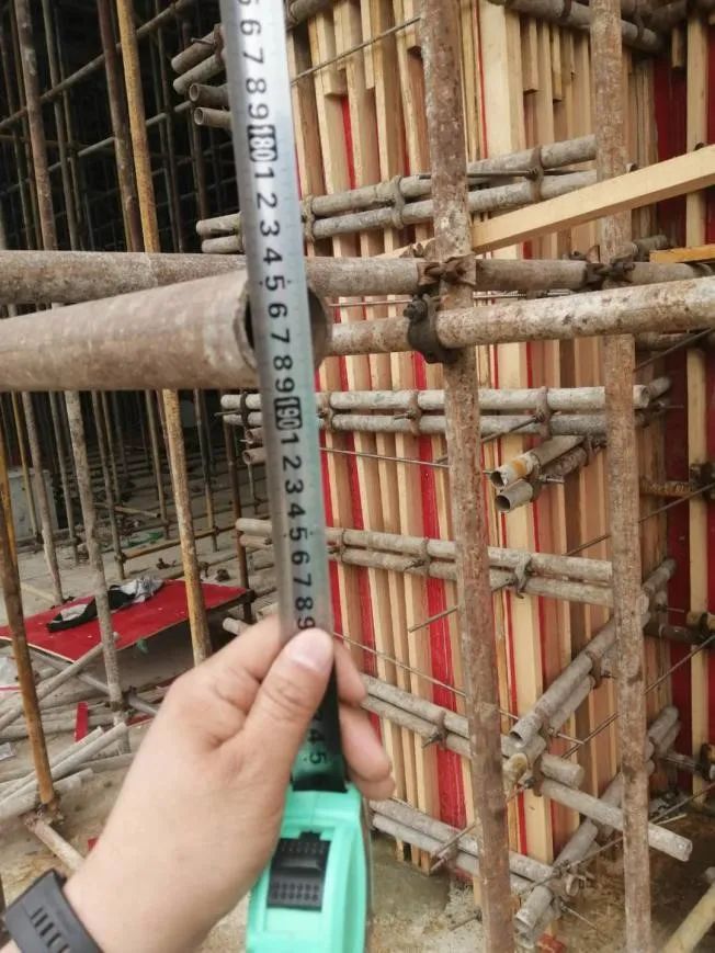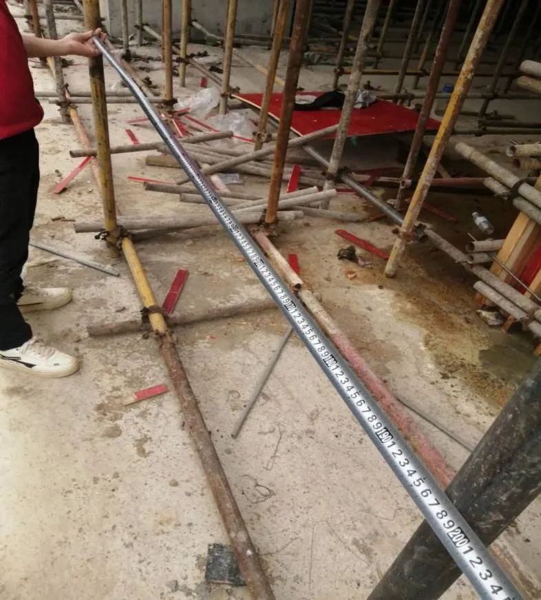 檢查小組在現場認真對項目大樓內支模架步距、縱距進行實測。實測中模架體立桿步距達到1.9米,縱距達到2米,嚴重違反了專項施工方案。板下部立桿已呈現嚴重傾斜狀態,檢查小組及時發現問題,要求監理部及時下發指令,督促整改,降低了質量安全事故發生概率。