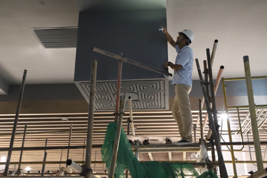 機會永遠都是留給有準備的人,“一個明智的人總是善于抓住機遇,把它變成美好的未來。”2019年6月,隨著精工業務不斷拓寬,汪工被調入鄭州市博物館項目,其中涉及到了裝飾布展工程,這對于汪工來說是一個全新的領域,同樣也意味著挑戰與機遇,他說“剛來這個項目的時候因為有些是之前沒學過的新工藝、新做法,感到很有壓力,心理落差也很大,失眠了好幾天,怕自己做不了、做不好。”但面對該項目他還是主動求變、奮進攻堅,工作中他整個人要么是在厚厚的資料與電腦旁,要么是在施工一線夾著資料手握工具用實踐檢驗理論技能,要么就在和同事領導討論交流學習,從剛開始的一頭霧水到茅塞頓開再到恍然大悟,就是這種善于鉆研的精神,用心追求著每一道工序、每一處細節上的完美,為創造精工品質而奮斗。